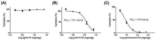 The ability of polyclonal anti-CTX IgY and monoclonal scFv S1 to inhibit CTX-induced cytotoxicity against muscle cells was assessed by LDH assays. Briefly, C2C12 cells were treated with a fixed amount of CTX (two-and-a-half times its IC50) in the presence of different concentrations of antibodies. Although CTX-induced cytolysis remained high at an IgY/CTX ratio of 25 (Figure 6A), pretreatment with scFv S1 significantly reduced the cytolytic effect of CTX on C2C12 cells (Figure 6B). CTX-induced cytolysis gradually decreased as scFv S1 concentration increased, with a dose–response curve showing that the ED50 of scFv S1 was about 3.81 mg/mg. These results suggested that scFv S1 is able to block the active domain of CTX and neutralize its toxicity toward muscle cells. Although the conventional antivenom, FNAV, was also found to inhibit CTX-induced cytotoxicity, its neutralization activity was significantly lower than that of scFv S1, as evident from their dose–response curves (Figure 6C). The ED50 of FNAV toward CTX-induced cytotoxicity was about 9.02 mg/mg.