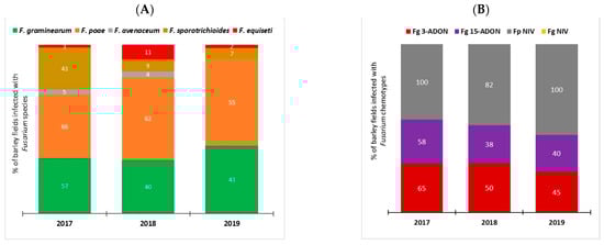 PCR-based identification of Fusarium species complex and chemotypes associated with Fusarium head blight on barley in Manitoba (2017–2019). (A) Stacked bar plot of Fusarium species DNA detected in commercial barley fields in Manitoba; (B) Distribution of Fusarium chemotypes detected in barley fields in Manitoba. Data from 149 samples or fields (2017, n = 44; 2018, n = 47; 2019, n = 58) were used for this analysis.