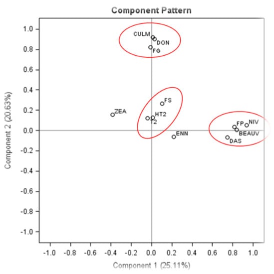 Principal component analysis (PCA) was performed to analyse correlations between the concentrations of Fusarium species (F. poae, F. graminearum, F. sporotrichioides from n = 149 samples) DNA and nine Fusarium mycotoxins (DON, NIV, BEA, HT2, T2, CULM, DAS, ENNs, and ZEA) using SAS v.9.4 (SAS Institute Inc. Cary, NC, USA).
