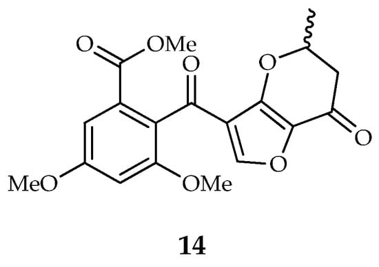 Penifupyrone (14) is the only member of the furopyrone type carrying a 5H-furo[3,2-b]pyran-7(6H)-one moiety instead of a γ-pyrone ring (Figure 3). It was isolated for the first time from an endophytic strain of Talaromyces sp., along with funicone, deoxyfunicone, and 3-O-methylfunicone [5].