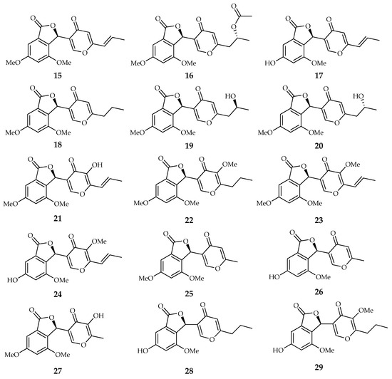 Structures of compounds from the phthalide type (15–29): vermistatin, acetoxydihydrovermistatin, 6-demethylvermistatin, 14,15-dihydrovermistatin, 2″-epihydroxydihydrovermistatin, hydroxydihydrovermistatin, hydroxyvermistatin, 5′-O-methyldihydrovermistatin, methoxyvermistatin, neosarphenol A, penisimplicissin, 6-demethylpenisimplicissin, 5′-hydroxypenisimplicissin, pinophilone C, and pinophilone D.