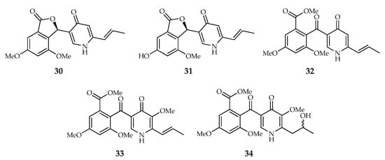 This series includes compounds containing a γ-pyridone moiety. The molecular structures of penicidone A and B (30,31) are characterized by the presence of an α-resorcylic acid moiety linked through a ketone group to a γ-pyridone, whereas penicidone C, D and talarodone A (32–34) contain the typical 4,6-dimethoxyphthalide moiety of vermistatin replacing the α-resorcylic acid nucleus (Figure 5). Nevertheless, Murakami et al. [18] represented penicidone D (33) in γ-pyridol form, instead of γ-pyridone form.