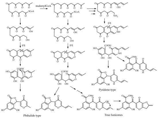 The potential biosynthetic pathways of funicone-like compounds have been investigated by two independent research groups [21,28]. Figure 6 shows a possible scheme for each type of compound proposed in the previous section. Funicone-like compounds are epta and octaketides, originating from units of acetate-mevalonate. The main structural differences can be caused by the folding of the eptaketidic and octaketidic chains, which produce structures with a methyl or a propenyl group, respectively, on the γ-pyrone ring. The presence of an amino group in compounds belonging to the pyridone type suggests a possible transamination process during the biosynthesis of γ-pyridone. The origin of the phthalide type can be attributed to the lactonization of the carboxylic group in the α-resorcylic ring, with the hydroxyl group produced through the reduction of the exocyclic ketone group.
