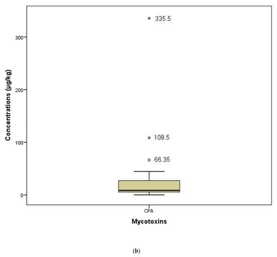 - Pleadin, J.; Vulić, A.; Perši, N.; Škrivanko, M.; Capek, B.; Cvetnić, Ž. Annual and regional variations of aflatoxin B1 levels seen in grains and feed coming from Croatian dairy farms over a 5-year period. Food Control 2015, 47, 221–225. [Google Scholar] [CrossRef]