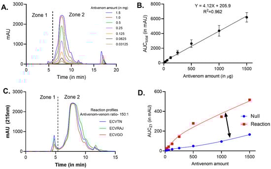Size-exclusion chromatography of antivenom and antivenom–venom complexes. (A) Overlay of elution profiles for different amounts of antivenom—0.31, 0.62, 0.125, 0.25, 0.5, 1 and 1.5 mg. (B) Calibration curve for the antivenom amount versus the AUCTotal—area under the curve for the entire chromatogram. The points represent the mean ± SD (n = 3). (C) Overlay of reaction profiles for three venom groups—ECVTN, ECVGO and ECVRAJ—at the antivenom–venom ratio of 150:1. A total of 1.5 mg of VINS antivenom (Batch No. 01AS20055) was incubated with a fixed amount of venom (10 µg) for 30 min at 37 °C before loading on the SEC column. Zone 1 is the area where antivenom–venom complexes are eluted and Zone 2 comprises unbound venom toxins and F(ab)2 molecules. (D) Relationship between the Zone 1 area of null and reaction profiles and the difference is represented by a double-headed arrow.