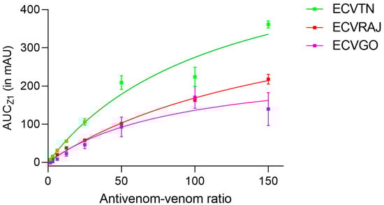 The binding curve for E. carinatus venom groups is plotted as a graph of different antivenom–venom ratios (150:1, 100:1, 50:1, 25:1, 12.5:1, 6.25:1, 3.125:1 and 1.5:1) and the AUCZ1. The AUCZ1 was estimated by subtracting the Z1 peak area of the reaction profile from the null profile for each of ECVTN, ECVRAJ and ECVGO—E. carinatus venom from Tamil Nadu, Rajasthan and Goa, respectively. Each data point represents the mean ± SD from three independent experiments. Binding parameters—the AUCmax and the EC50—are reported with 95% CI in Supplementary Table S1. Two-way ANOVA showed that venom toxin binding to antivenom was significantly different (F(2,40) = 117.6, p < 0.0001).