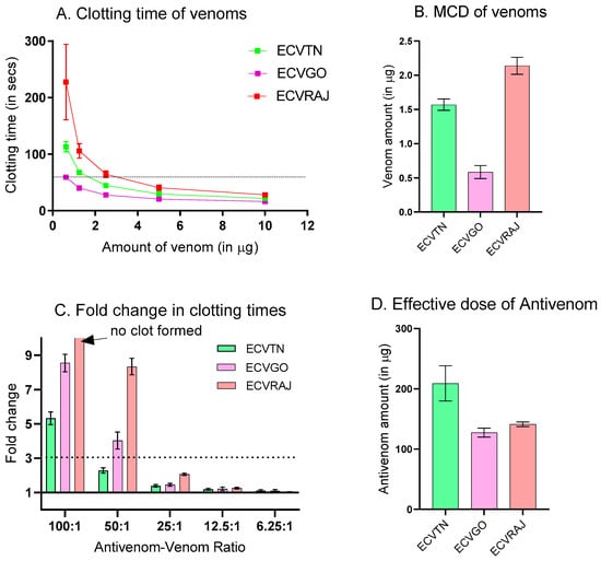 (A) Plasma clotting times plotted against the amount of E. carinatus venoms (n = 6; p < 0.0001). Clotting times were estimated from the plasma of two healthy donors and readings were taken in triplicate for each plasma. The dashed line corresponds to the clotting time of 60 s. (B) The minimum clotting dose (MCD), defined as the amount of venom required to form plasma clots in 60 s, is represented as a bar plot for all venom groups. One-way ANOVA was performed to show that MCDs were significantly different (p < 0.0001). (C) Fold change in clotting times for different antivenom–venom ratios for each venom group. Double the MCD of each venom group was taken as the challenge dose and incubated with increasing amounts of antivenom for 30 min at 37 °C before testing for residual activity (n = 6). (D) The effective dose of antivenom is defined as the amount of antivenom required to increase the clotting time by 3-fold for ECVTN, ECVGO, and ECVRAJ E. carinatus venom from Tamil Nadu, Goa and Rajasthan. The symbols and bars represent the mean ± SD (n = 6; p < 0.0001). The neutralization of clotting activity by antivenom was shown to be significantly different against venom groups measured using one-way ANOVA (F = 34.01, p < 0.0001).