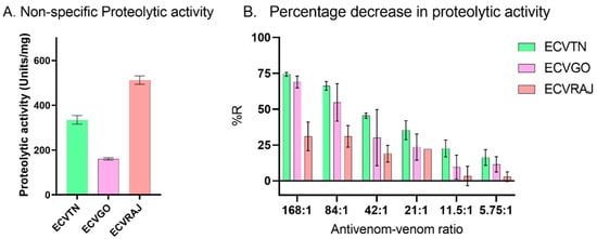 We observed significant differences in the activity of venom groups (F = 491.8, p < 0.0001), with ECVRAJ showing the greatest activity at 512.4 U/mg, followed by ECVTN (335.2 U/mg) and ECVGO (160.7 U/mg) (Figure 4A). The decrease in activity represented as the %R is presented in Supplementary Table S5. At the highest antivenom–venom ratio of 168:1, we observed the %R saturation at 31 ± 10% for ECVRAJ compared to 74.3 ± 1.4% for ECVTN and 68.9 ± 4.1% for ECVGO (Figure 4B).