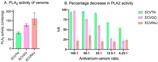 (A) PLA2 activity (n = 4) for E. carinatus venoms at 5 µg (n = 2) and 2.5 µg (n = 2) was measured using a commercial EnzChek PLA2 assay kit. ECVGO, ECVRAJ and ECVTN E. carinatus venoms were from Goa, Rajasthan and Tamil Nadu, respectively. Enzymatic activity was calculated as described in Section 2.3.3 and expressed in units/mg (n = 4). PLA2 activity was significantly different, as shown by one-way ANOVA (p < 0.001). (B) Percentage reduction (%R) in the PLA2 activity of E. carinatus venom (5 µg) after preincubation (30 min, 37 °C) with different amounts of antivenom. The bars represent the mean ± SD for ECVTN (n = 3), ECVGO (n = 3) and ECVRAJ (n = 2).