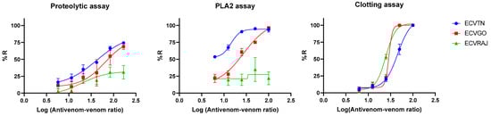 Dose–response curves for the percentage reduction in the proteolytic, PLA2 and clotting activities of E. carinatus venoms at different antivenom–venom ratios (expressed on a log10 scale). The curves were constructed based on the percentage reduction captured in Figure 3, Figure 4 and Figure 5. See the corresponding figures and legends for the amounts of venom and antivenom and the preincubation conditions used in each case. ECVGO, ECVRAJ and ECVTN E. carinatus venoms from Goa, Rajasthan and Tamil Nadu, respectively. The points represent the mean ± SD.