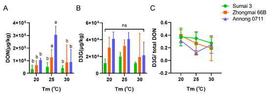 At 20 °C, the DON and D3G contents showed significant differences between Sumai 3 and Zhongmai 66B, Sumai 3 and Annong 0711, and the D3G content significantly differed in all three cultivars (Figure 3A,B). At 25 °C, the DON content showed a significant difference between Sumai 3 and Annong 0711, Zhongmai 66B and Annong 0711, and the D3G content showed a significant difference between the three cultivars (Figure 3A,B). At 30 °C, the DON content showed a significant difference among the three groups, and the D3G content showed a significant difference between Sumai 3 and Zhongmai 66B, Sumai 3 and Annong 0711(Figure 3A,B). Compared with F. graminearum F1-infected Sumai 3, the ratios of D3G and total DON of F. graminearum F1-infected Zhongmai 66B and Annong 0711 groups were significantly different at 20 °C and 30 °C (Figure 3C). At 25 °C, only the ratios of Zhongmai 66B and Sumai 3 were statistically different (Figure 3C).