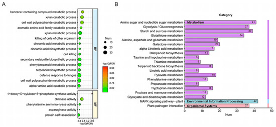 The GO analysis placed the DEGs into three categories based on their functions: biological process (BP), cellular component (CC), and molecular function (MF). Upregulated DEGs were significantly enriched in eight GO terms; among these terms, functions associated with CC followed by MF accounted for a large proportion (Table S2). KEGG pathway maps included seven categories: metabolism, genetic information processing, environmental information processing, cellular processes, organismal systems, human diseases, and drug development. Upregulated genes were significantly enriched in “glutathione metabolism” and “ribosome biogenesis in eukaryotes” (Table S3). For downregulated genes, the top 20 significantly enriched terms mainly belonged to BP and MF, among which the gene number in “defense response to fungi” was the largest (Figure 5A). According to the KEGG analysis, the top 20 maps of downregulated genes were distributed in metabolism, environmental information processing, and organismal systems categories (Figure 5B).