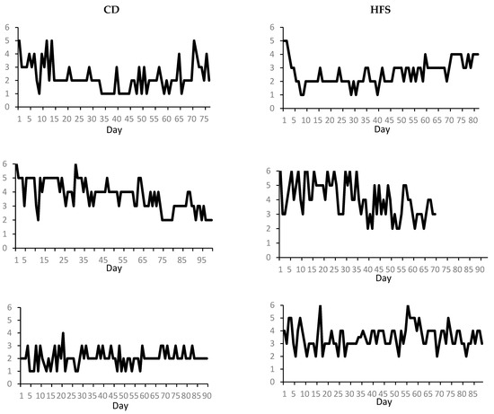 Sample graphs of daily perceived symptom intensity scores in selected CD patients (left column) and HFS patients (right column) with expected U-shaped courses (first row, d = 2), continuous worsening (second row, d = 1), and no detectable trends (third row, d = 0).