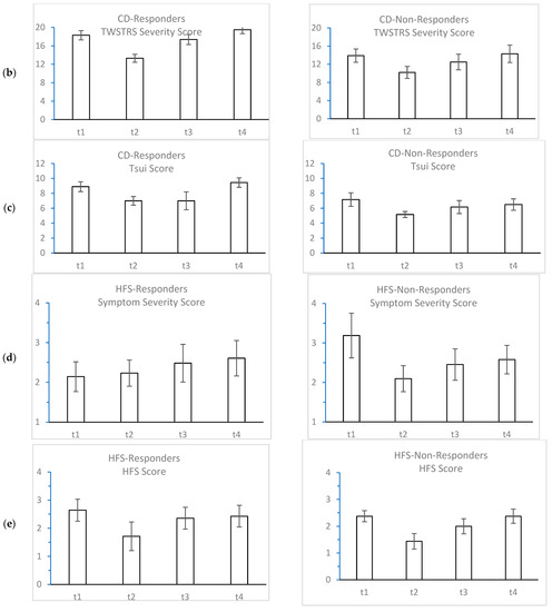 Mean scores (±standard errors) of perceived symptom intensities for responders and non-responders in CD patients (a–c) and HFS patients (d,e) at four time points across a BoNT cycle. TWSTRS Toronto Western Spasmodic Torticollis Rating Scale. HFS Score based on the Jankovic Rating Scale.