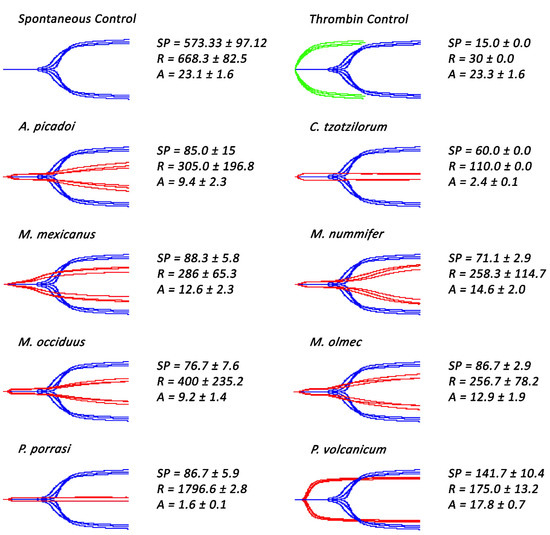 Thromboelastography traces showing Atropoides/Cerrophidion/Metlapilcoatlus venoms ability to clot human plasma in comparison to the spontaneous control. Samples showed to possess pseudo-procoagulant (Atropoides/Cerrophidion/Metlapilcoatlus) and procoagulant (P. volcanicum) venoms. Blue traces represent spontaneous controls, green traces represent thrombin control, and red traces represent samples incubated with venoms. SP = split point, which is the time taken until the clot began to form (min). R = time to initial clot formation, where formation is 2 mm + (min). A (amplitude) = clot strength (mm). Assays were performed in triplicate (n = 3) with data representing the mean ± SD.