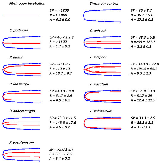 Thromboelastography traces showing effects of two Cerrophidion and seven Porthidium species venoms that did not directly clot fibrinogen. A solution of fibrinogen was incubated for 30 min either alone (for the thrombin control) or with venoms, followed by the addition of thrombin. The green trace represents the 30 min fibrinogen incubation for all samples. Blue traces represent samples in which thrombin was added to fibrinogen in the absence of venom. Red traces represent samples in which venoms were incubated with a fibrinogen solution for 30 min, followed by the addition of thrombin. SP = Split point, i.e., the time taken until a clot began to form (min). R = time to initial clot formation, where formation is 2 mm + (min). A (amplitude) = clot strength (mm). Assays were performed in triplicate (n = 3) with data representing the mean ± SD.