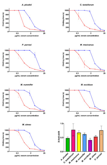 Concentration–response curves showing the pseudo-procoagulant effects and the relative efficacy of the PoliVal-ICP antivenom. Curves represent the clotting time of both the venom-only assay (red) and the incubation-with-antivenom assay (blue). The bar graph represents the X-fold shift value of each venom when incubated with antivenom. Calculated values represent antivenom neutralization, where 0 is no neutralization and >0 indicates neutralization. Assays were performed in triplicate (n = 3), excluding P. porrasi, which was in duplicate (n = 2) due to a shortage of venom supply. Data represent the mean ± SD. Note: some data points have error bars that are smaller than the size of the symbol.