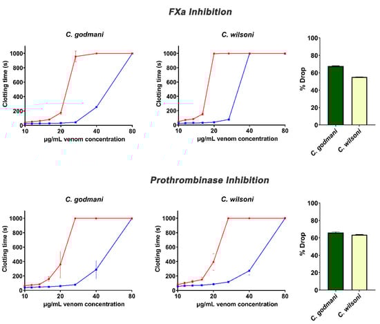 As previously noted, Porthidium species, as well as C. godmani and C. wilsoni, were potently anticoagulant, and all of them exceeded the machine maximum recording time (Figure 1). Further factor inhibition assays revealed that C. godmani and C. wilsoni inhibited Factors IXa, Xa, and XIa, and prothrombinase, as did diverse Porthidium species (Figure 4). Only P. dunni was observed to inhibit thrombin, producing a significant delay in clotting time within the thrombin-inhibition assay (Figure 4). Future work is required to ascertain which toxin types are responsible for inhibiting the clotting factors, with characterized inhibitors of clotting enzymes in viperid-snake venoms such as kunitz peptides, the alpha–beta covalently-linked dimeric-form of lectin toxins, and Group II phospholipase A2 toxins [35,41,42,43].