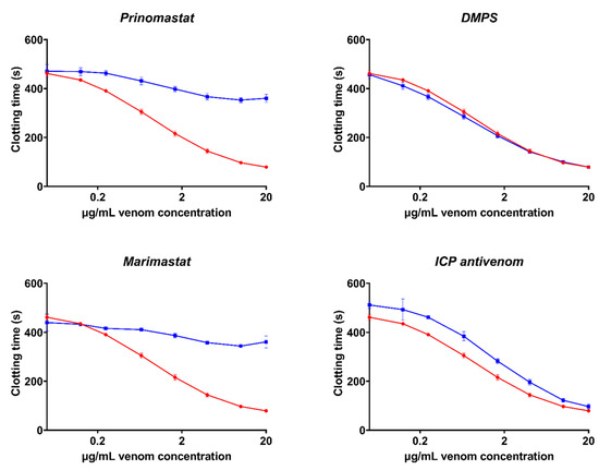 Concentration–response curves showing the procoagulant effect of P. volcanicum venom on plasma and the relative efficacy of three SVMP inhibitors and the PoliVal-ICP antivenom in neutralizing the venom effects. Curves represent the venom-only assay (red) and the incubation-with-inhibitor/antivenom assay (blue). Assays were performed in triplicate (n = 3) with data representing the mean ± SD. Note: some data points have error bars that are smaller than the size of the symbol.