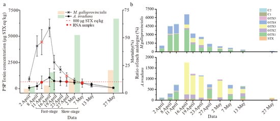 Results of PSTs accumulation in M. galloprovincialis and A. irradians. (a) The line graph represents the PSTs concentrations in M. galloprovincialis and A. irradians from 2 April to 27 May and the bar graphs characterize the mortality of M. galloprovincialis and A. irradians during the experiment. (b) Ratio of different PST analogues over time (the units for analogues content were converted to μg STX eq/kg). Notes: values are expressed as means ± SD of three replicate samples.