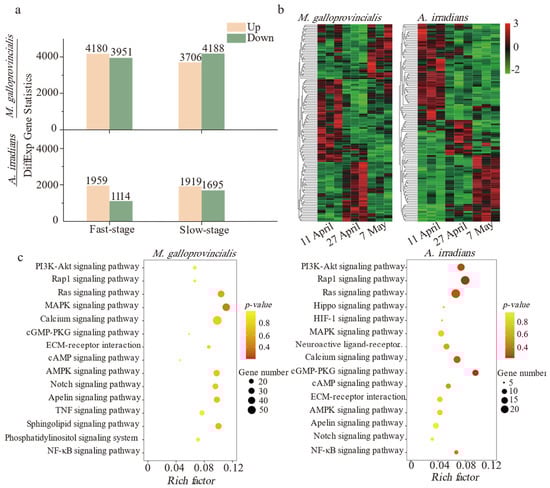 Difference and enrichment analysis based on the KEGG database after PSTs exposure. (a) Histogram of differentially expressed genes of M. galloprovincialis and A. irradians in the Fast-stage and Slow-stage (DEGs are filtered by fold change ≥ 2 and p-value ≤ 0.05). (b) Thermogram of differentially expressed genes in M. galloprovincialis and A. irradians. Color intensities on the heatmap indicate relative expression levels (RPKM), with log-transformed (log2) expression values ranging from −2 to 3 (3 biological replicates were available for each time point). (c) Bubble diagram of significant enrichment pathways (fold change ≥ 2 and p-value ≤ 0.05) in the Fast-stage.
