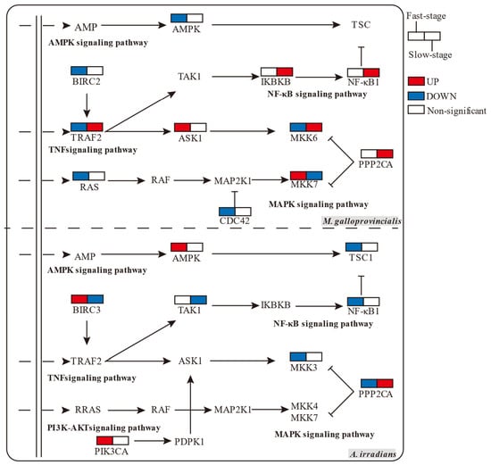 Comparison of expression of core genes in inflammation-related enrichment signal pathways in M. galloprovincialis and A. irradians at the Fast-stage and Slow-stage (colored boxes represent genes significantly up- or down-regulated, p-value < 0.05).