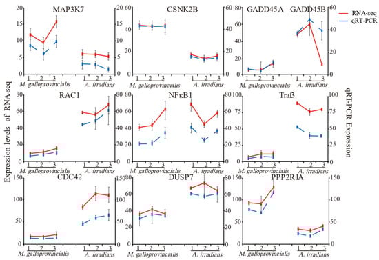 To confirm the results of RNA-Seq in this study, 10 common genes of M. galloprovincialis and A. irradians involved in MAPK, TNF, NF-κB, and AMPK signaling pathways were selected, and qRT-PCR was applied to examine the expression levels of these genes (Figure 4). Although these genes exhibited different expression patterns, the qPCR results were consistent with the RNA sequencing (RNA-seq) results at different timepoints, confirming the accuracy and reliability of the transcriptome sequencing data.