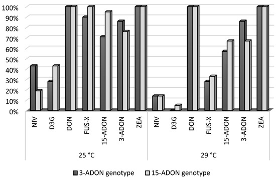 The strains of the 3-ADON genotype incubated at 25 °C temperature produced NIV, FUS-X, and 3-ADON at higher concentrations than the strains of the 15-ADON genotype (Table 1). The strains of the 15-ADON genotype produced DON, ZEA, 15-ADON, and D3G at higher concentrations than the strains of the 3-ADON genotype. The strains of the 3-ADON genotype incubated at 29 °C produced NIV and 3-ADON at higher concentrations than those of the 15-ADON genotype. The strains of the 15-ADON genotype produced DON, ZEA, 15-ADON, FUS-X, and D3G at higher concentrations than the 3-ADON genotype strains.