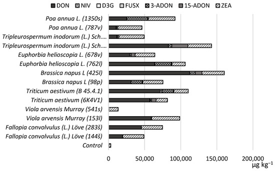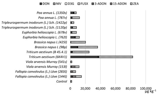 Regarding the strain-dependent potential for mycotoxin production, we found that all strains can produce DON in spring wheat grains incubated at 25 °C. Figure 2 shows the mycotoxin production potential and concentrations compared to the control sample. All strains are potential producers of DON and ZEA in spring wheat grain. Poa annua L. (1350s) and Euphorbia helioscopia L. (762l) strains produced higher concentrations of 3-ADON than the strain isolated from the primary host plant—Triticum aestivum (B 45.4.1). Some of the highest concentrations of 15-ADON were produced by the Tripleurospermum inodorum (L.) Sch. (1120p) strain. The presence of NIV was also detected, but the average concentrations were lower, ranging from <100 to 2273 µg kg−1. Overall, the strain of Brassica napus L (425l) produced the highest amounts of toxins.