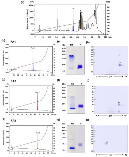 B. atrox venom was fractionated via RP-HPLC using an RP100 C18 column, resulting in 20 major fractions accordingly to our previous study [4], in which, the peaks 3 (RT = 55 min), 8 (RT = 65 min), and 9 (RT = 67 min) contained the relevant PLA2s fractions previously identified, and they represent the PLA2s analyzed in this study (Figure 1a). The fractions were collected and resubmitted separately to the same chromatography, resulting in three isolated toxins, termed FA1 (Figure 1b), FA3 (Figure 1c), and FA4 (Figure 1d). The PLA2 fractions were checked for homogeneity using SDS-PAGE under reducing (R) and non-reducing (NR) conditions. Under reducing conditions, the electrophoretic patterns of the three fractions were similar, with molecular masses ranging from 15 to 16 kDa. However, in non-reducing conditions, the electrophoretic profile of the FA1 and FA3 fractions showed two smear bands spanning from ~40 to 16 kDa, with a higher staining intensity in the region of ~40 kDa in FA1 (Figure 1e), and a stronger 16 kDa band in FA3 (Figure 1f), suggesting the presence of dimeric forms of these proteins. A single band of ~15 kDa was stained in the FA4 non-reduced fraction (Figure 1g). The isoelectric profiles of the PLA2s were analyzed using bidimensional electrophoresis, with non-linear pH values ranging from 3 to 10, showing important variations in the pI values of the proteins. FA1 and FA3 showed basic pIs of 8.4 and 8.2 (Figure 1h,i), while FA4 presented a pI of 5.1, characteristic of acidic PLA2s (Figure 1j), respectively. The FA1 fraction presented an extra spot of the same pI around 40 kDa, even in the presence of reducing and alkylating agents that may correspond to low levels of contamination with SVMPs further detected via MS.