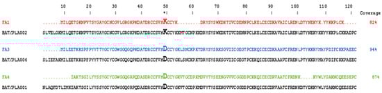 Sequence alignment of identified peptides with complete B. atrox PLA2 sequences. Peptides of FA1, FA2, and FA3 identified using mass spectrometry were aligned against PLA2 sequences previously characterized in B. atrox venom using the CLUSTAL W multiple alignment package. Dots represent the uncovered regions, positions not elucidated by MS/MS, of BATXPLA002 (Accession number JAV01882.1), BATXPLA006 (Accession number JAV01878.1), and BATXPLA001 (Accession number JAV01883.1) by peptides identified in FA1, FA3, and FA4, respectively. Asterisk indicates the amino acid residue at 49 position (*).