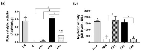 Characterization of catalytic and myotoxic activities of isolated PLA2s. The PLA2 catalytic activity (a) was determined using NOBA as substrate and 0.3 µg/20 μL of PLA2 samples or crotoxin B (CB), as a positive control or 20 μL of standard buffer (C−, negative control). The absorbance was measured at 425 nm, and the results are expressed as Abs/min/µg of protein. Symbols indicate differences that are statistically significant for p ≤ 0.005: (*) CB compared to FA1, FA4, and negative control; (#) FA3 compared to FA4 fraction and negative control; (Ф) FA3 compared to FA1 fraction; (∆) FA3 compared to FA4 fraction. (α) FA4 fraction compared to negative control. Myotoxic activity (b) was measured via CK levels in the serum of mice (n = 5), after intramuscular injection in the gastrocnemius muscle of 25 µg of the PLA2s, dissolved in 50 µL of PBS. Control groups received injections containing 50 µL of PBS only (negative control) or 50 µg/50 µL of B. jararacussu venom (Jssu) as a positive control. After 3 h, blood samples were collected and the CK levels were assayed in serum samples using a commercial kit CK-UV (Bioclin) and with CK levels expressed in U/L. Symbols indicate differences that are statistically significant for p ≤ 0.005: (*) PBS group compared to Jssu; (#) Jssu group compared to FA4; (&) FA1 group compared to PBS; (Ф) FA4 compared to FA1; (Δ) FA3 group compared to FA4. Results are expressed as mean ± SD or mean ± SEM of three independent experiments for PLA2 activity and myotoxic activity, respectively.