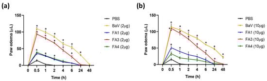 Evaluation of edema formation after intraplantar injection of the PLA2s. Groups of five mice were injected subcutaneously into the footpad of the right hind paw with samples of the fractions (FA1, FA3, and FA4) containing 2 µg (a) or 10 µg (b) dissolved in 30 µL sterile PBS. Control groups were injected with the same volume of PBS (negative control) or B. atrox venom (BaV) at the same doses as fractions. The edematogenic activity was evaluated at different times: 0 min (before the treatment), 30 min, 1, 2, 4, 24, and 48 h (after treatment). Edema was estimated using the increase in paw thickness after the injection of the fractions, using a plethysmometer to measure the difference in volume displaced (µL). The data represent the mean ± SEM of three independent experiments. Symbol (*) indicates differences statistically significant for p ≤ 0.005 compared to the PBS control group.