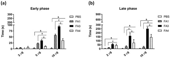 Nociceptive response in mice after intraplantar injection of the PLA2s. Fractions (2, 5, or 10 µg/30 µL) were dissolved in sterile PBS injected (i.pl.) into the right hind paw of mice (n = 5). Control groups were injected with 30 μL of sterile PBS only. The nociceptive response, evaluated by the reactivity of animals to lick the injected foot, was scored in seconds: (a) response in the early or neurogenic phase (from 0 to 5 min after the injection); (b) late or inflammatory phase (from 15 to 30 min after the injection). The data represent the mean ± SEM of three independent experiments. Symbols indicate differences statistically significant for p ≤ 0.005: (&) PBS group compared to FA1, FA3, and FA4; (#) FA1 group compared to FA3 and FA4; (∆) FA3 group compared to FA4; (*) FA3 group compared to FA1.