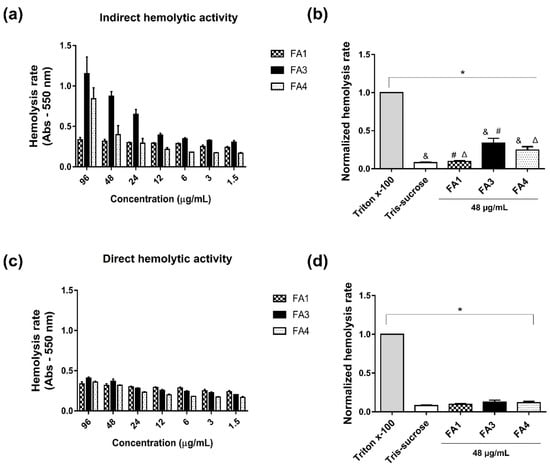 Evaluation of the hemolytic activity induced by the PLA2s. The hemolytic activity of the PLA2s was tested using washed human red blood cells. Serially diluted concentrations (96, 48, 24, 12, 6, 3, and 1.5 µg/mL) of the fractions FA1, FA3, and FA4 were added to 100 µL of erythrocyte suspensions (1 × 108) and incubated for 1 h with gentle mixing at 37 °C. Next, plates were added with 50 µL of human serum of the same donor for the indirect test (a,b), or with 50 µL of Tris-sucrose buffer for the evaluation of indirect hemolytic activity (c,d), and incubated under the same experimental conditions. For the controls, 50 µL of 3% Triton X-100 (positive) or 50 µL of Tris-sucrose (negative) were used. The samples were centrifuged (200× g for 5 min, 25 °C), and the absorbance of the supernatant was measured in a spectrophotometer at 550 nm. The experiments were performed in triplicate, and the results represent the mean ± SD of three independent experiments. Symbols indicate differences that are statistically significant for p ≤ 0.005: (*) positive control compared to Tris-sucrose, and to FA1, FA3, and FA4 fractions; (&) Negative control (Tris-sucrose) compared to FA3 and FA4; (∆) and (#) FA1 compared to FA3 and FA4, respectively.