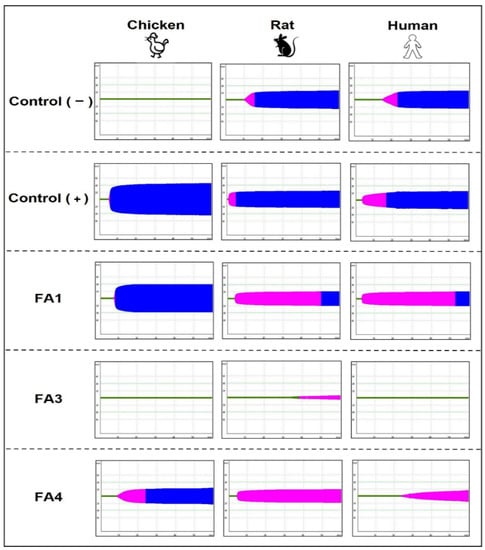 Furthermore, the interference of the isolated PLA2s on the blood coagulation system was investigated using different plasmas (human, rat, and chicken) and the clotting times were recorded by rotational thromboelastometry, evaluating the main parameters: clotting time (CT), the clot formation time (CFT), and the maximum clot firmness (MCF). As observed in Figure 7 and Table 1, spontaneous plasma coagulation, using PBS as the negative control, was observed in rat and human plasmas, but chicken plasma remained unclotted during the experimental time, clotting only after the addition of the ellagic acid-based activator of coagulation (positive control). Concerning the isolated PLA2s, the FA1 fraction reduced the coagulation parameters induced by the ellagic acid-based activator in the three plasmas tested, substantially increasing the CFTs of human and rat plasmas, and reducing the MCF values of all plasmas compared to the positive control. The FA4 fraction induced a slight increase in the CT, prolonging the CFT and reducing the MCF parameter in all plasmas. The FA4 anticoagulant activity was even more evident in human plasma, significantly altering the main parameters evaluated when compared with samples incubated only with the ellagic acid. The FA3 fraction was the most potent anticoagulant, maintaining human and bird plasmas unclotted for the period of 1 h and significantly reducing the coagulation of rat plasma when compared to the results obtained in tests with spontaneous coagulation or in the presence of the coagulation activator. Therefore, all fractions presented degrees of anticoagulant activity, which was more prominent in fraction F3.