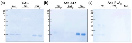 Antigenic reactivity of the PLA2s with different antivenoms, evaluated via immunoblotting. Samples containing 10 µg of each PLA2 were separated in a 15% SDS-PAGE gel under reducing conditions using DTT (+) and non-reducing (−) conditions. The proteins were transferred onto nitrocellulose membranes, which were blocked and incubated with (a) SAB (1:1000); (b) anti-ATX (1:100); or (c) anti-PLA2 (1:40). Immunoreactivity was detected using IgG conjugated to peroxidase of anti-horse (SAB), anti-rabbit (anti-ATX), or anti-mice (anti-PLA2) antivenoms, diluted 1:1000. The reactive bands were developed with 0.05% 4-chloro-1-naphthol in 15% (v/v) methanol, in the presence of 0.03% (v/v) H2O2.