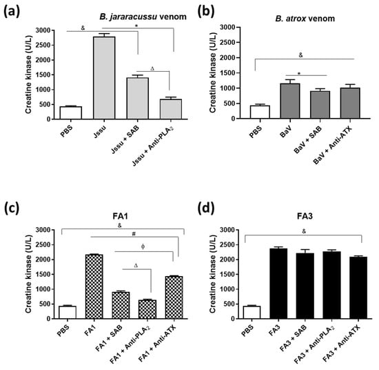 Neutralization by antivenoms of the myotoxic activity induced by FA1 and FA3 PLA2 fractions. The neutralizing efficacies of the different antivenoms (SAB, Anti-ATX, and Anti-PLA2) were evaluated in groups of 5 mice, intramuscularly (i.m.) injected into the gastrocnemius muscle, with samples containing 25 µg/50 µL of the B. jararacussu venom (a), B. atrox venom (b) or the myotoxins FA1 (c) or FA3 (d), 50 µL of PBS (negative control), previously incubated with SAB, anti-ATX or anti-PLA2, as appropriate (0.2 µL of AV/µg of PLA2). Three hours after inoculation, blood samples were collected from the mice orbital plexus and centrifuged (2000× g for 5 min, 4 °C) to obtain the sera. CK levels of the sera were measured using a commercial kit, CK-UV (Bioclin), and expressed as U/L. The data shown represent mean ± SD of three experiments. Symbols indicate differences statistically significant for p ≤ 0.005: (&) PBS group compared to Jssu, and Jssu + SAB; (*) Jssu group compared to Jssu + SAB, and Jssu + anti-PLA2; (∆) Jssu + SAB group compared to Jssu + anti-PLA2. (&) PBS group compared to Jssu and Jssu + SAB; (*) Jssu group compared to Jssu + SAB, and Jssu + anti-PLA2; (∆) Jssu + SAB group compared to Jssu + anti-PLA2. (&) PBS group compared to FA1, FA1 + SAB, FA1 + anti-PLA2, and FA1 + anti-ATX; (#) FA1 group compared to FA1 + SAB, FA1+ anti-PLA2, and FA1 + FA1 + anti-ATX; (ϕ) FA1 + SAB group compared to FA1 + anti-PLA2, and FA1 + anti-ATX; (∆) FA1 + SAB group compared to FA1 + anti-PLA2. (&) PBS group compared to FA3, FA3 + SAB, FA3 + anti-PLA2, and FA3 + anti-ATX.