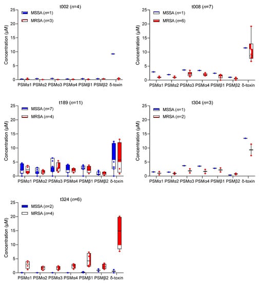 2.3. Association between In Vitro PSM Production, Methicillin-Resistance, SCCmec Type, and spa Type