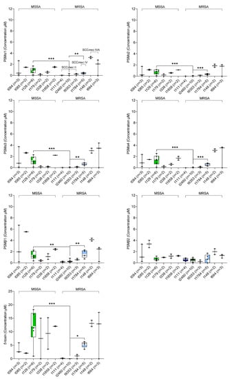 - Qi, R.; Joo, H.-S.; Sharma-Kuinkel, B.; Berlon, N.R.; Park, L.; Fu, C.; Messina, J.A.; Thaden, J.T.; Yan, Q.; Ruffin, F.; et al. Increased in vitro phenol-soluble modulin production is associated with soft tissue infection source in clinical isolates of methicillin-susceptible Staphylococcus aureus. J. Infect. 2016, 72, 302–308. [Google Scholar] [CrossRef]