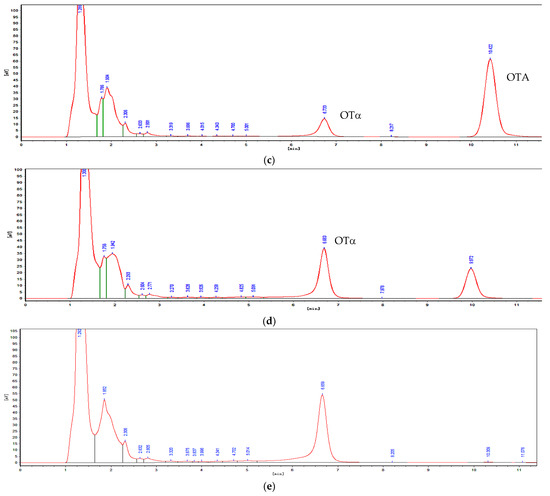 Determination of OTA degradation by HPLC. (a) LB culture medium with OTA standard. (b) OTα standard. (c) 30 % of OTA was degraded by ANSA176. (d) 75 % of OTA was degraded by ANSA176. (e) OTA was completely degraded by ANSA176.