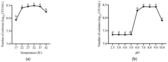 Growth characteristics of ANSA176. (a) Growth at different temperatures during a 24 h period. (b) Growth at different pH during a 24 h period. Data are presented as means ± SEM. a–d The different letters mean significant difference (p < 0.05).