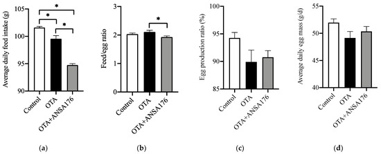 Effects of OTA and ANSA176 on production performance of layers. (a) Average daily feed intake. (b) Feed/egg ratio. (c) Egg production ratio. (d) Average daily egg mass. Data are presented as means ± SEM. The differences are defined as * p < 0.05.