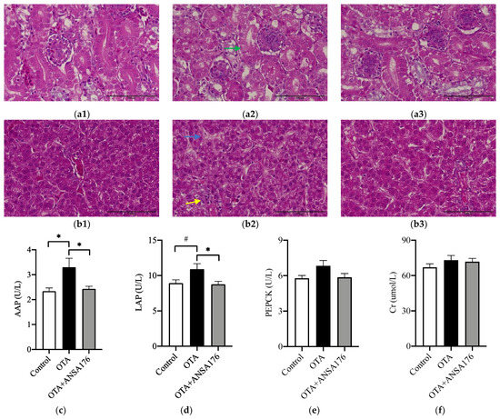 Effects of OTA and ANSA176 on kidney and liver damage related parameters in layers. (a,b) Histopathological examination of kidney (a1, control; a2, OTA; a3, OTA + ANSA176) and liver (b1, control; b2, OTA; b3, OTA + ANSA176) tissues by H&E staining. Magnification times, 400 × (scale bars = 100 µm). Lesions such as epithelial cells degeneration (green arrow), inflammatory infiltration (yellow arrow), and hyaline degeneration (blue arrow) are shown with arrows. (c–i) Serum biochemical parameters. Data are presented as means ± SEM. The differences are defined as # 0.05 ≤ p < 0.10 and * p < 0.05.