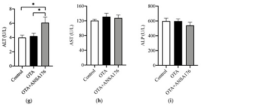 As shown in Figure 6c,d, the serum alanine aminopeptidase (AAP) (p < 0.05) and leucine aminopeptidase (LAP) (p = 0.05) levels increased in the OTA group compared to the control group, whereas the supplementation of ANSA176 obviously decreased (p < 0.05) them. The concentration of serum alanine aminotransferase (ALT) was significantly higher (p < 0.05) in the OTA + ANSA176 group than in the control and OTA groups. No differences (p > 0.10) were observed in phosphoenolpyruvate carboxykinase (PEPCK), creatinine (Cr), aspartate aminotransferase (AST), and alkaline phosphatase (ALP) among the three groups (Figure 6e,f,h,i).