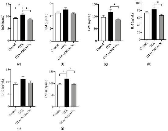 Effects of OTA and ANSA176 on immune and inflammatory response of layers. (a–j) Levels of TP, ALB, β2-MG, IgA, IgG, IgM, LZM, IL-2, IL-10, and TNF-α. Data are presented as means ± SEM. The differences are defined as # 0.05 ≤ p < 0.10 and * p < 0.05.
