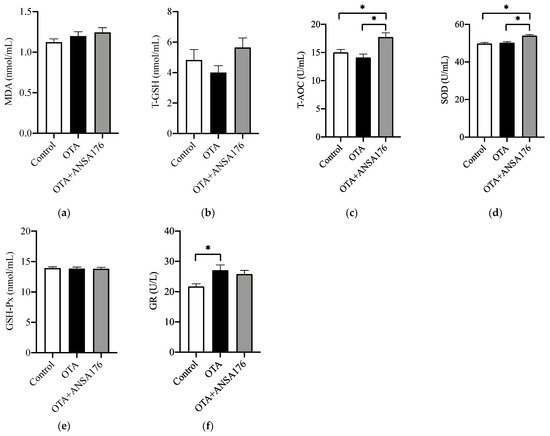 Effects of OTA and ANSA176 on oxidative stress and antioxidant status of layers. (a–f) Levels of MDA, T-GSH, T-AOC, SOD, GSH-Px, and GR. Data are presented as means ± SEM. The differences are defined as * p < 0.05.