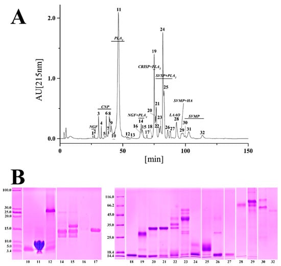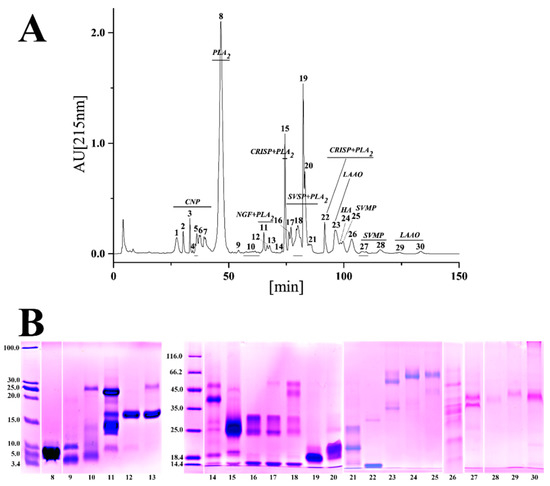 4.2. Separation of Venom Proteins by RP-HPLC and SDS-PAGE