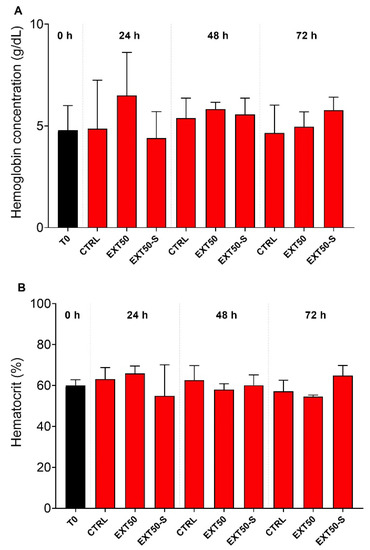 (A) Blood hemoglobin concentration (g dL−1) and (B) hematocrit (%) of juvenile Atlantic salmon before (0 h) and during 24 h, 48 h and 72 h exposure to the anesthetic (50 mg L−1) without stress (EXT50), or with handling stress (EXT50-S). Bars indicate mean ± SD (n = 6). No significant differences were observed between groups under 2-way ANOVA (p > 0.05).