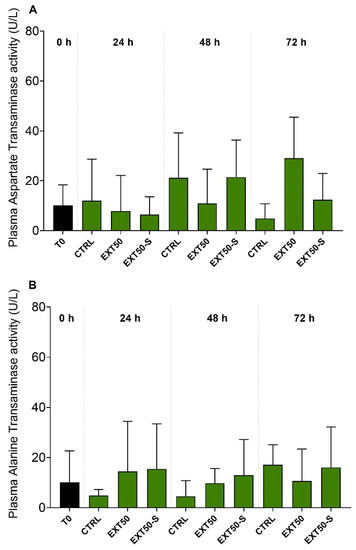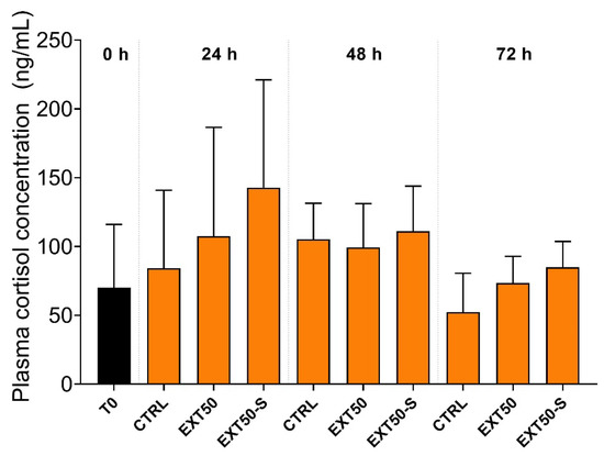 Plasma cortisol levels also did not differ significantly between groups (Figure 4), despite a visibly steady increase in the EXT50-S group at 24 h. However, at 48 h and 72 h, all groups presented levels similar to the initial moment (0 h, before exposure).